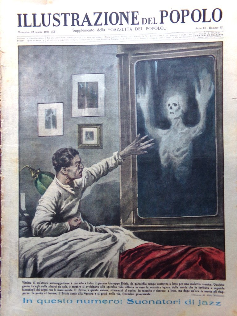 Vittima di un'atroce suggestione è rimasto a Intra il giovane Giuseppe Brizio, da parecchio tempo costretto a letto per una malattia cronica. Qualche giorno fa egli volle alzarsi da solo, e mentre si avvicinava allo specchio vide riflessa in esso la macabra figura della morte che lo invitava a seguirlo facendogli dei segni con le mani ossute. Il Brizio, a questa visione, stramazzò al suolo; fu raccolto e rimesso a letto, ma dopo un'ora la morte gli riapparve. In preda al terrore, il Brizio corse alla finestra e si gettò nella via ferendosi gravemente (Aldo Molinari)