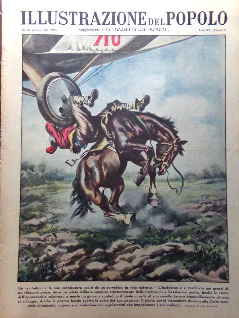 Un contadino e la sua cavalcatura uccisi da un aeroplano in volo radente. L'incidente si è verificato nei pressi di un villaggio greco dove un pilota militare compiva ripetutamente delle evoluzioni a bassissima quota, finché le ruote dell'apparecchio colpirono a morte un giovane contadino il quale in sella al suo cavallo faceva tranquillamente ritorno al villaggio. Anche la povera bestia subiva la sorte del suo padrone. Il pilota dovrà rispondere davanti alla Corte marziale di omicidio colposo e di violazione dei regolamenti che impediscono i voli radenti (Aldo Molinari)