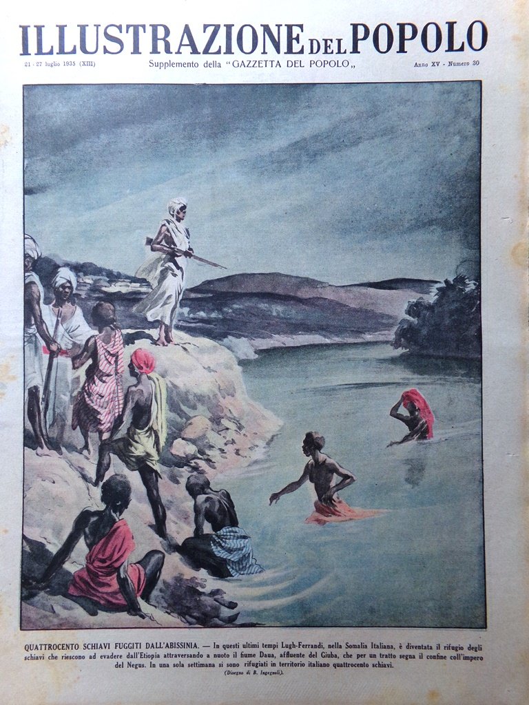 In questi ultimi tempi Lugh-Ferrandi nella Somalia Italiana è diventata il rifugio degli schiavi che riescono ad evadere nell'Etiopia attraversando a nuoto il fiume Daua, affluente del Giuba, che per un tratto segna il confine coll'impero del Negus. In una sola settimana si sono rifugiati in territorio italiano quattrocento schiavi (B. Ingegnoli)