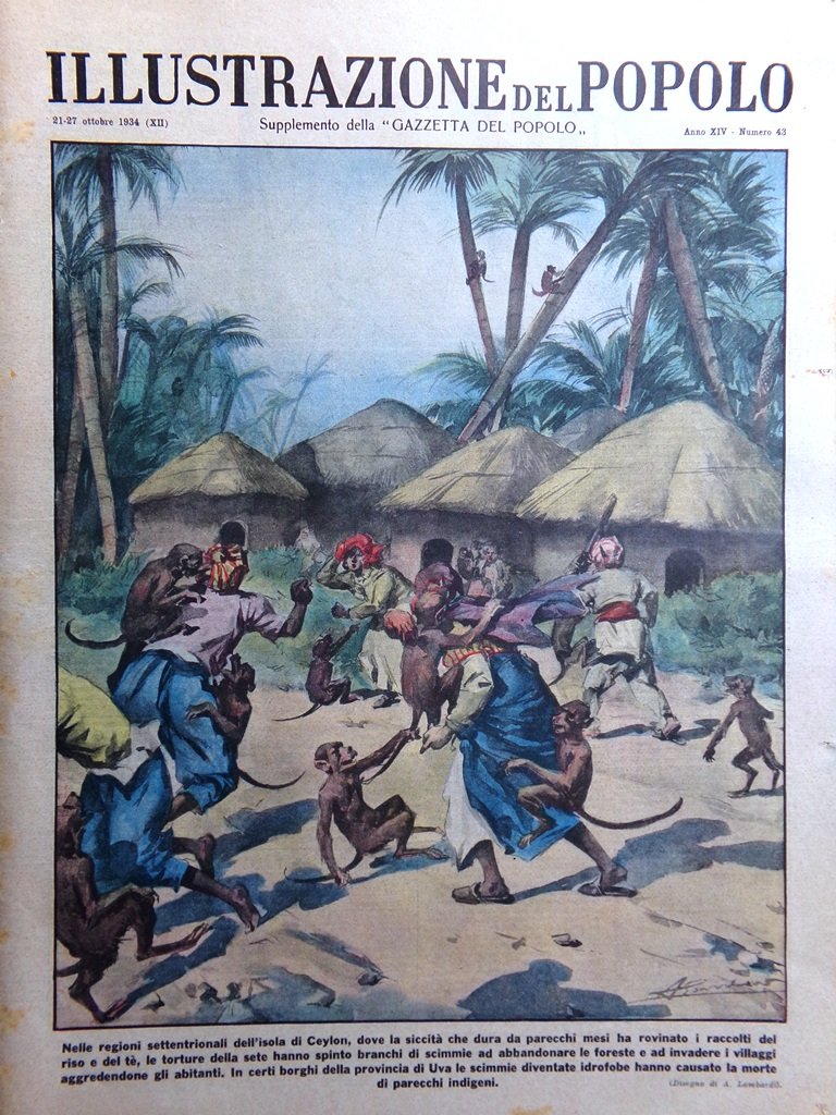 Nelle regioni settentrionali dell'isola di Ceylon, dove la siccità che dura da parecchi mesi ha rovinato i raccolti del riso e del tè, le torture della sete hanno spinto branchi di scimmie ad abbandonare le foreste e ad invadere i villaggi aggredendone gli abitanti. In certi borghi della provincia di Uva le scimmie diventate idrofobe hanno causato la morte di parecchi indigeni (A. Lombardi)