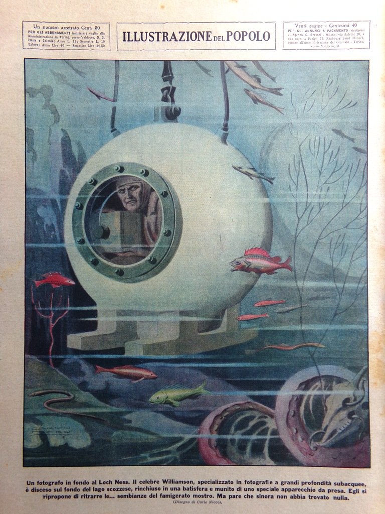 Un fotografo in fondo al Loch Ness. Il celebre Williamson, specializzato in fotografie a grandi profondità subacquee è disceso sul fondo del lago scozzese, rinchiuso in una batisfera e munito di uno speciale apparecchio da presa. Egli si ripropone di ritrarre le. sembianze del famigerato mostro. Ma pare che sinora non abbia trovato nulla (Carlo Nicco)