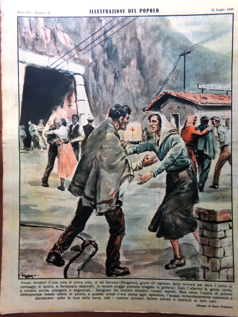 Alcuni minatori d'una cava di pietra cote, in val Seriana (Bergamo), giunti all'ingresso della miniera per dare il turno ai compagni di lavoro, si fermavano sbalorditi: le reecenti piogge avevano allagato la galleria! Dato l'allarme la gente corse, e corsero anche, piangenti e angosciati, i famigliari dei ventitre minatori rimasti sepolti. Non valse l'opera di potenti elettropompe messe subito in azione, e quando ormai s'era persa ogni speranza, l'acqua miracolosamente cominciò a decrescere: sotto la luce delle torce, tutti i ventitre minatori furono salvati e restituiti ai loro cari (Mario D'Antona)