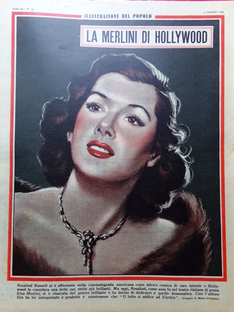 Rosalind Russell si è affermata nella cinematografia americana come attrice comica di raro talento e Hollywood la considera una delle sue stelle più brillanti. Ma oggi, Rosalind, come anni fa nel teatro italiano di prosa Elsa Merlini, si è stancata del genere brillante e ha deciso di dedicarsi a quello drammatico. Così l'ultimo film da lei interpretato e prodotto è nientemento che: "il lutto si addice ad Elettra" (Mario D'Antona)