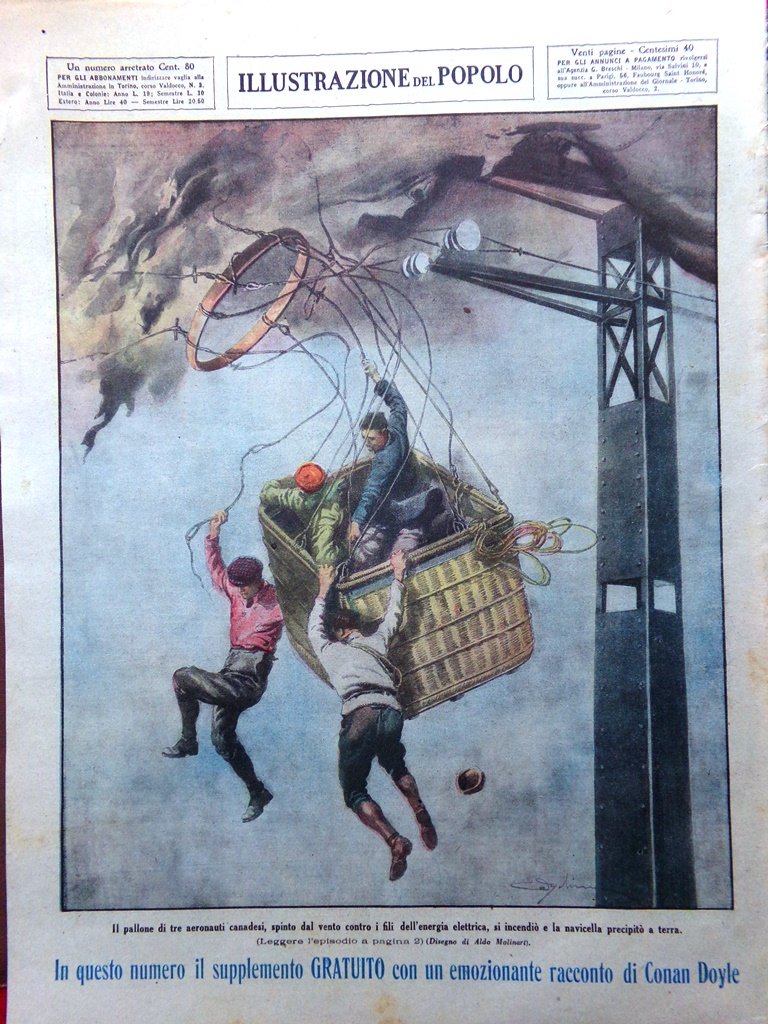 Il pallone di tre aeronauti canadesi, spinto dal vento contro i fili dell'energia elettrica, si incendiò e la navicella precipitò a terra (Aldo Molinari)