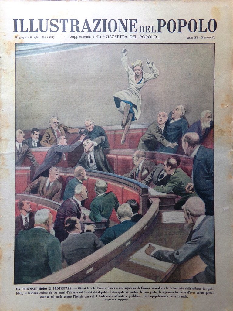 Giorni fa alla Camera francese una signorina di Cannes, scavalcata la balaustrata della tribuna del pubblico, si lasciava cadere da tre metri d'altezza sui banchi dei deputati. Interrogata sui motivi del suo gesto, la signorina ha detto d'aver voluto protestare in tal modo contro l'inerzia con cui il Parlamento affronta il problema. del ripopolamento della Francia (B. Ingegnoli)