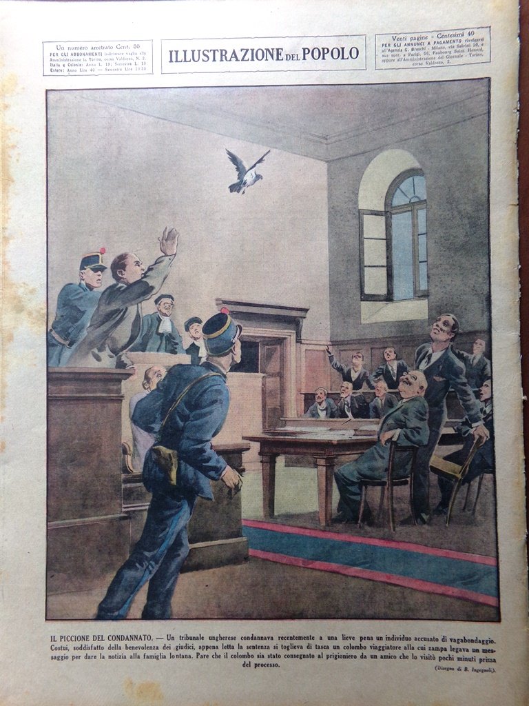 Un tribunale ungherese condannava recentemente a una lieve pena un individuo accusato di vagabondaggio. Costui, soddisfatto della benevolenza dei giudici, appena letta la sentenza si toglieva di tasca un colombo viaggiatore alla cui zampa legava un messaggio per dare la notizia alla famiglia lontana. Pare che il colombo sia stato consegnato al prigioniero da un amico che lo visitò pochi minuti prima del processo (B. Ingegnoli)