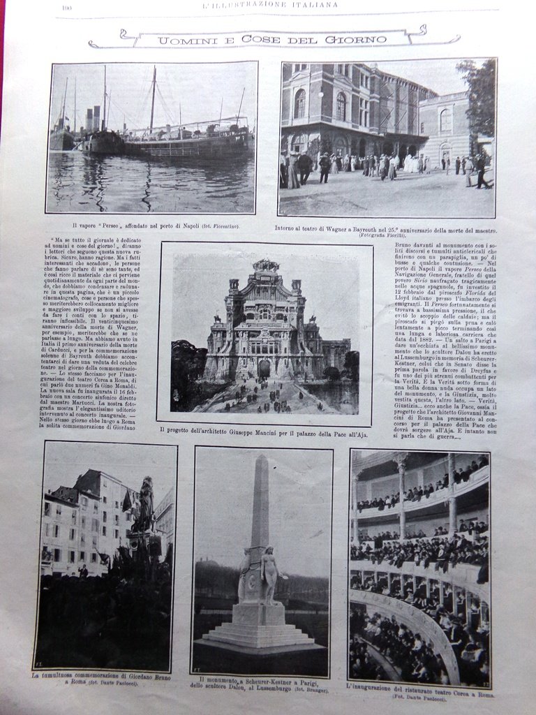Uomini e cose del giorno: il progetto di Giuseppe Mancini per il palazzo dell'Aja, il monumento a Scheurer-Kestner a Parigi (Dalon), la commemorazione di Giordano Bruno a Roma