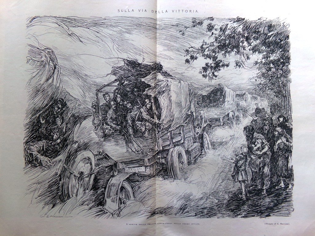 L'arrivo delle truppe liberatrici nelle terre invase (disegno di G. Mazzoni) (Stampa a 2 pagine)