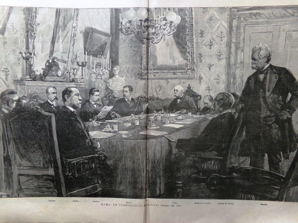 Roma: un consiglio di ministri (Stampa a 2 pagine) - Mocenni, Boselli, Sonnino, Blanc, Crispi, Ferraris, Calenda dei Tavani, Baccelli