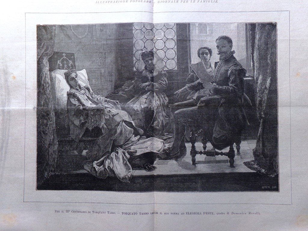 Per il III centenario di Torquato Tasso - Torquato Tasso legge il suo poema ad Eleonora d'Este (quadro di Domenico Morelli) (Stampa a 2 pagine)