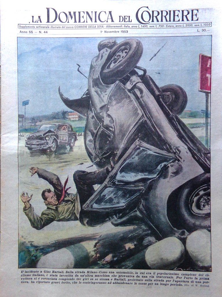 L'incidente a Gino Bartali. Sulla strada Milano-Como un'automobile in cui era il popolarissimo campione del ciclismo italiano, è stata investita da un'altra macchina che proveniva da una via trasversale. Per l'urto la prima vettura si è rovesciata compiendo tre giri su se stessa e Bartali, proiettato sulla strada per l'apertura di una portiera, ha riportato gravi ferite, che lo costringeranno ad abbandonare le corse per un lungo periodo (Walter Molino)
