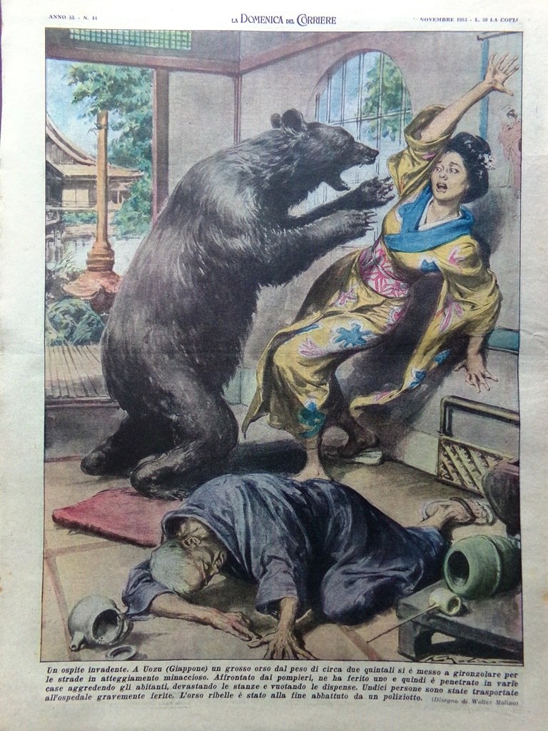 A Uozu (Giappone) un grosso orso dal peso di circa due quintali si è messo a gironzolare per le strade in atteggiamento minaccioso. Affrontato dai pompieri, ne ha ferito uno e quindi è penetrato in varie case aggredendo gli abitanti, devastando le stanze e vuotando le dispense. undici persone sono state trasportate all'ospedale gravemente ferite. L'orso ribelle è stato alla fine abbattuto da un poliziotto (Walter Molino)