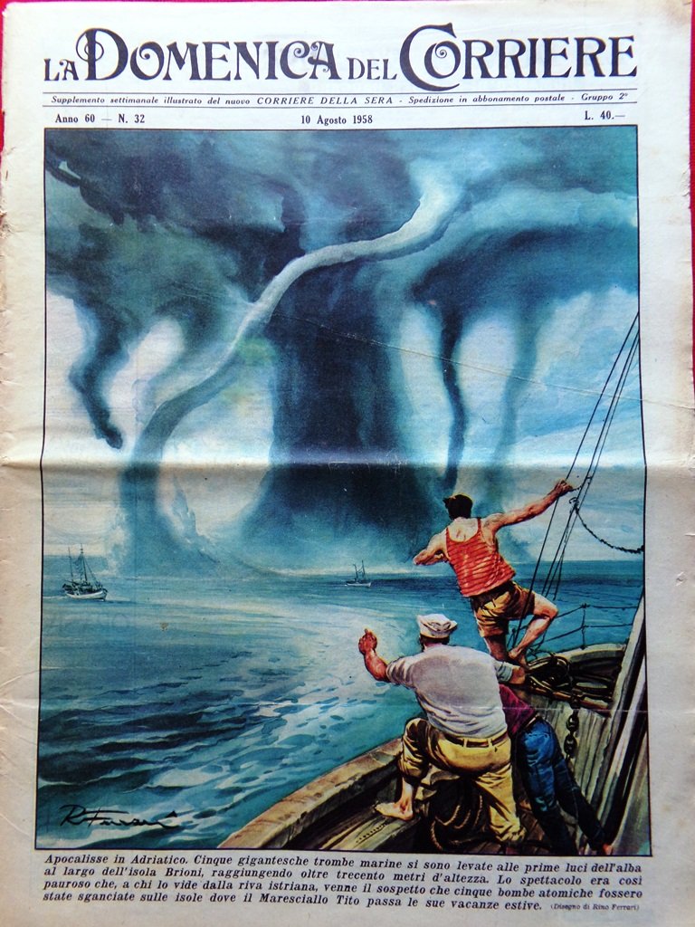 Apocalisse in Adriatico. Cinque gigantesche trombe marine si sono levate alle prime luci dell'alba al largo dell'isola Brioni raggiungendo oltre trecento metri d'altezza. A chi lo vide dalla riva istriana è venuto il sospetto che cinque bombe atomiche fossero state sganciate sulle isole dove il Maresciallo Tito passa le vacenze estive (Rino Ferrari)