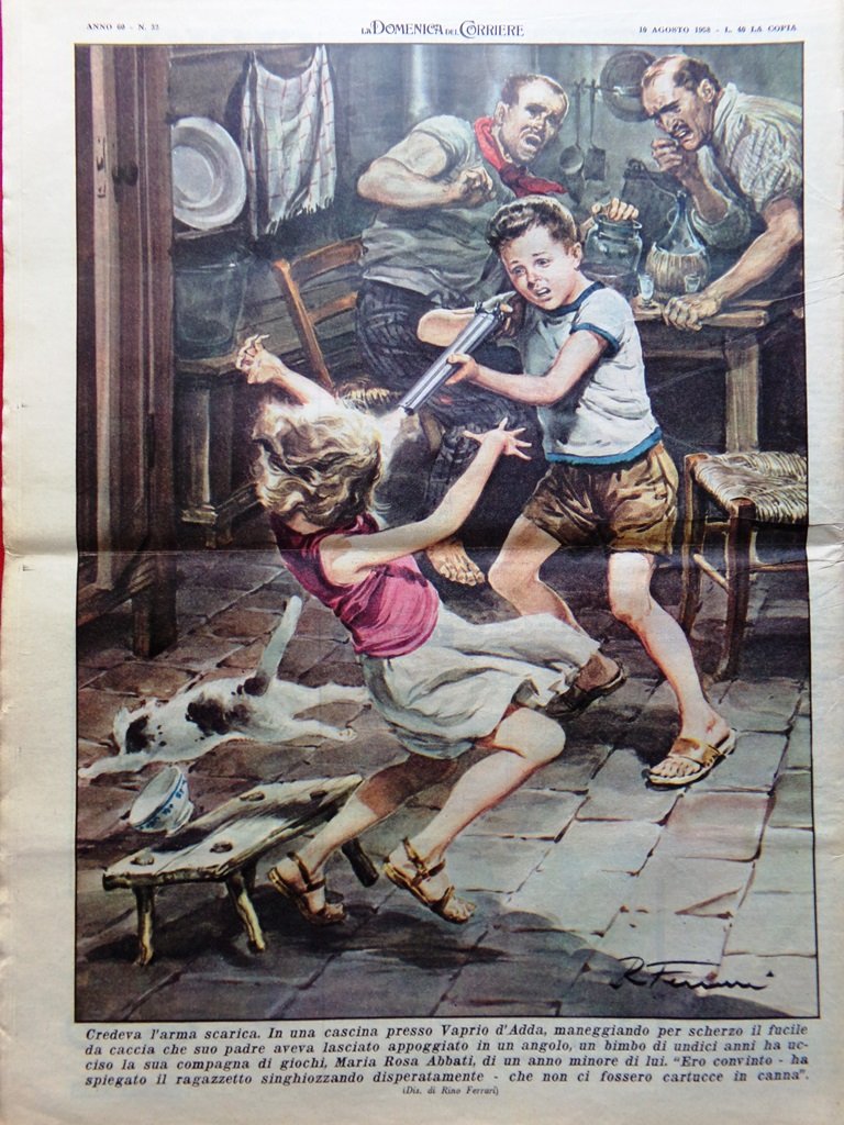 In una cascina presso Vaprio d'Adda, maneggiando per scherzo il fucile da caccia che suo padre aveva lasciato appoggiato in un angolo, un bimbo di undici anni ha ucciso la sua compagna di giochi Maria Rosa Abbati, di un anno minore di lui (Rino Ferrari)