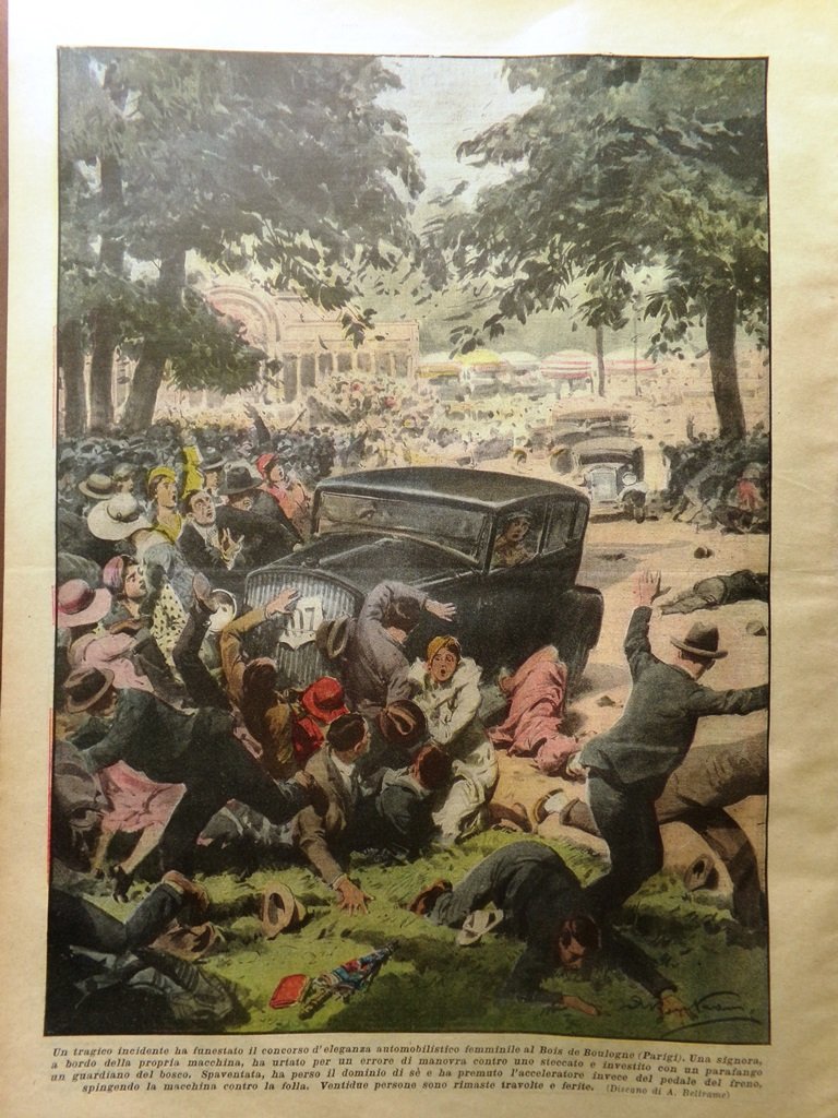 Un tragico incidente ha funestato il concorso d'eleganza automobilistico femminile al Bois de Boulogne (Parigi). Una signora, a bordo della propria macchina, ha urtato per errore contro uno steccato e investito un guardiano del bosco. Spaventata, ha perso il dominio di se e ha spinto la macchina contro la folla travolgendo ventidue persone (Achille Beltrame)