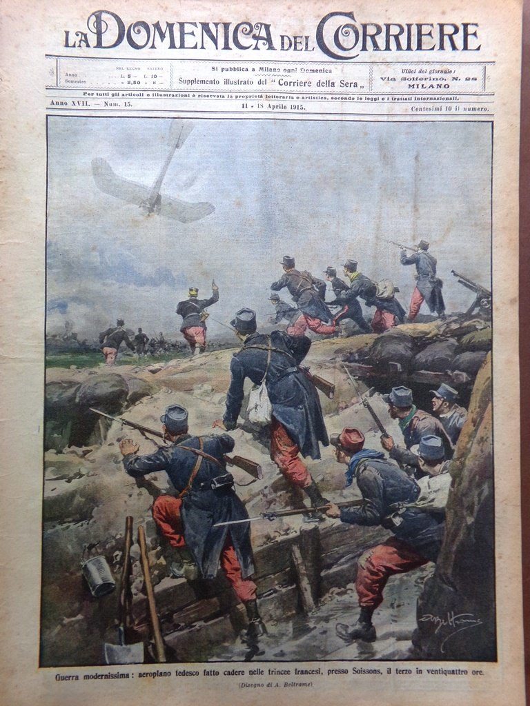 Guerra modernissima: aeroplano tedesco fatto cadere nelle trincee francesi, presso Soissons, il terzo in 24 ore (Achille Beltrame)