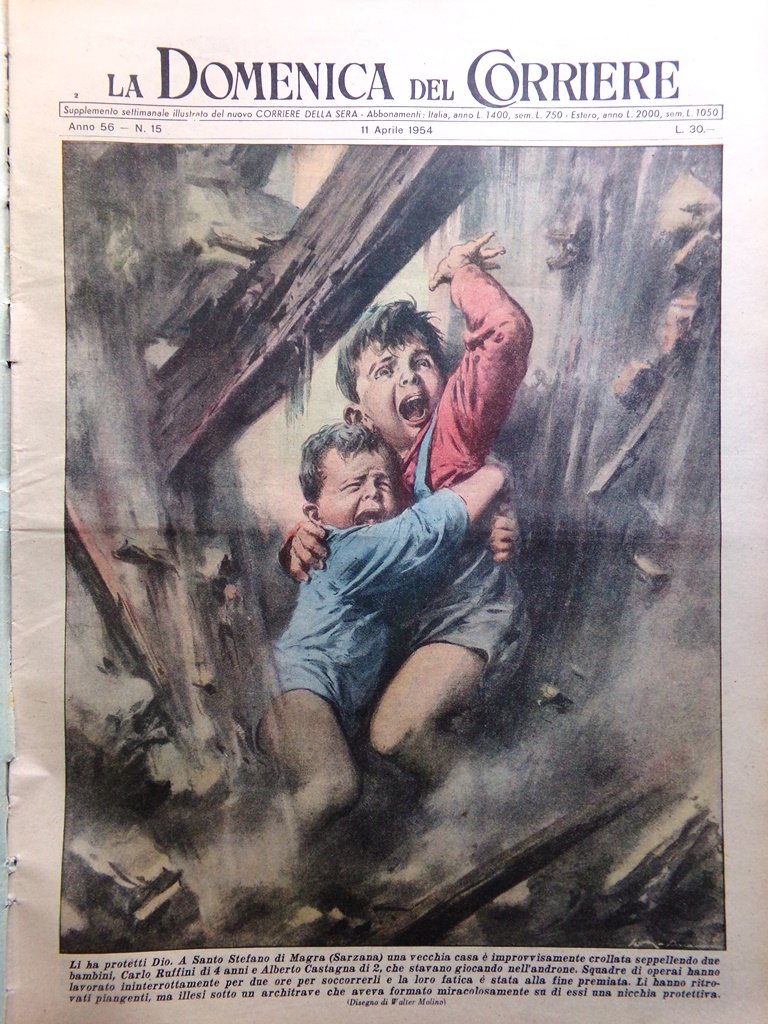 Li ha protetti Dio. A Santo Stefano di Magra (Sarzana) una vecchia casa è improvvisamente crollata seppellendo due bambini, Carlo Ruffini di 4 anni e Alberto Castagna di 2, che stavano giocando nell'androne. Squadre di operai hanno lavorato ininterrottamente per due ore per soccorlerli e la loro fatica è stata alla fine premiata. Li hanno ritrovati piangenti, ma illesi sotto un architrave che aveva formato miracolosamente su di essi una nicchia protettiva (Walter Molino)