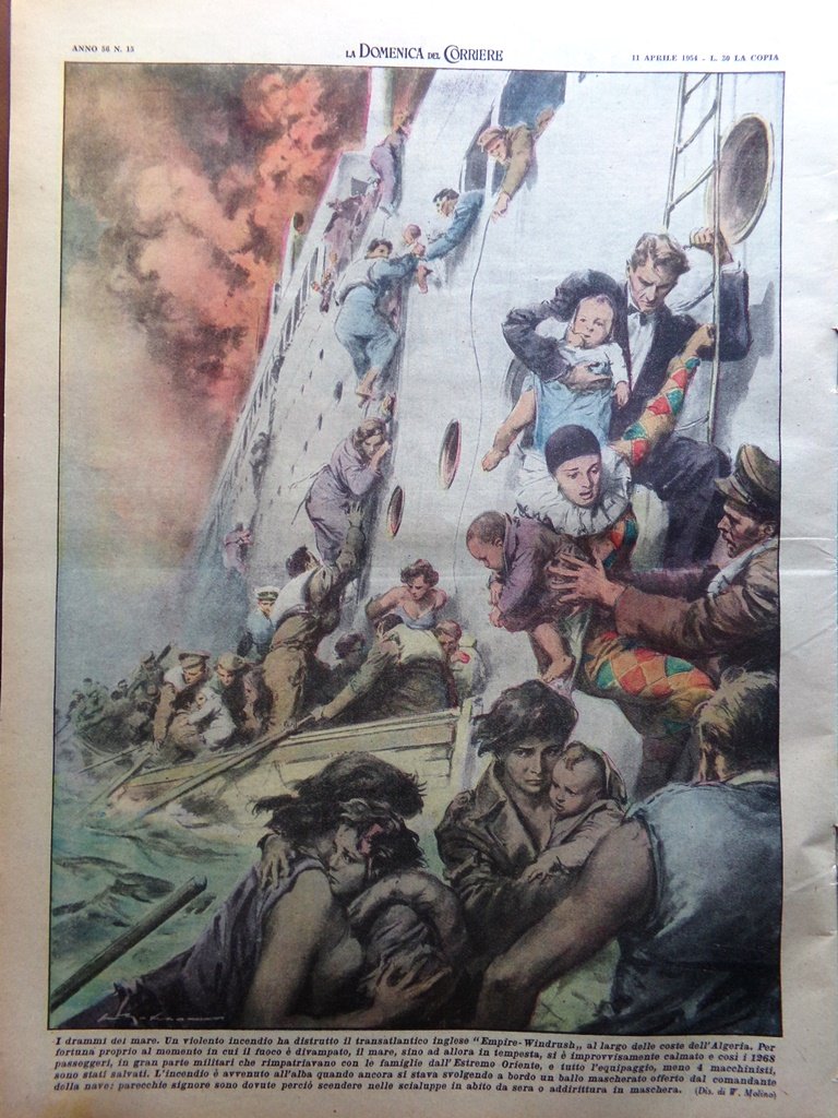 Un violento incendio ha distrutto il transatlantico inglese "Empire-Windrush", al largo delle coste dell'Algeria. Per fortuna proprio al momento in cui il fuoco è divampato il mare, sino ad allora in tempesta si è improvvisamente calmato e così i 1268 passeggeri sono stati salvati (Walter Molino)