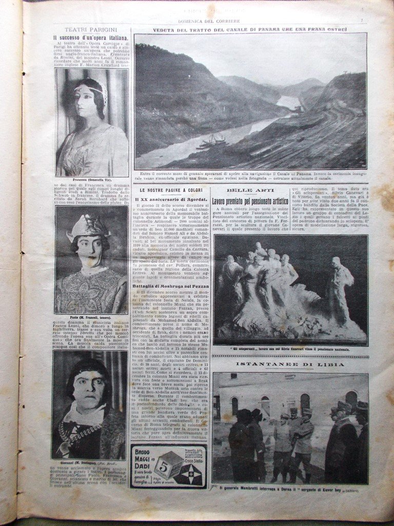 LA DOMENICA DEL CORRIERE Rivista del 11 Gennaio 1914 Anno 16 nr. 2 pagine: 16 dimensioni: 38 x 28 cm IN PRIMA PAGINA: Nel XX anniversario della battaglia di Agordat: la mssa sugli spalti del forte davanti del monumento ai caduti (Achille Beltrame) NELL'ULTIMA PAGINA: Natale di sangue e di valore: combattimento di Moshruga contro i ribelli che impedivano l'avanzata della colonna Miani nel Fezzan (Achille Beltrame) ALL'INTERNO: Veduta del tratto del canale di Panama ostruito da una frana Il successo dell'opera "Francesca da Rimini" del maestro Leoni Il teatro greco di Siracusa Nuove ferrovie: 40 milioni per 40 chilometri Camille Flammarion e l'ideale Messina a 5 anni dall'immane disastro: l'ospedale La misura del tempo CONDIZIONI DELLA RIVISTA: BUONE, NORMALI SEGNI DEL TEMPO. SOVRACOPERTINE ASSENTI NOTE PARTICOLARI: MACCHIE DEL TEMPO IN ALCUNE PAGINE