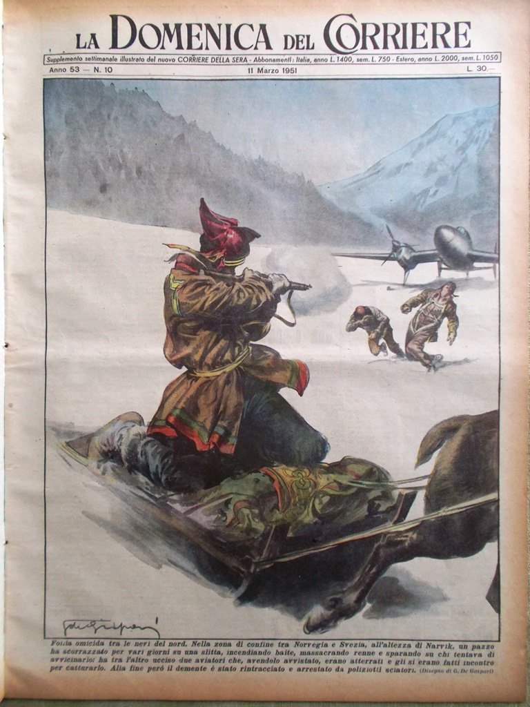 Nella zona di confine tra Norvegia e Svezia, all'altezza di Narvik, un pazzo ha scorazzato per vari giorni su una slitta, incendiando baite, massacrando renne e sparando su chi tentava di avvicinarlo: ha tra l'altro ucciso due aviatori che, avendolo avvistato, erano atterrati e gli si erano fatti incontro per catturarlo. Alla fine però il demente è stato rintracciato e arrestato da poliziotti sciatori (De Gaspari)