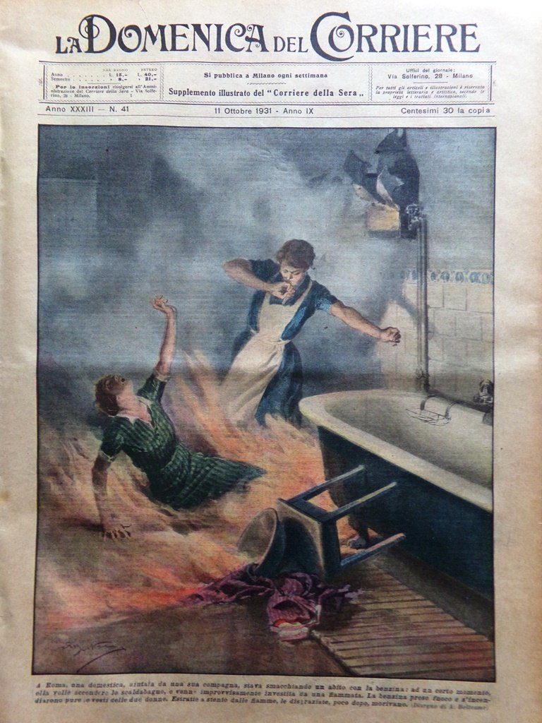 A Roma una domestica, aiutata da una sua compagna, stava smacchiando un abito con la benzina: a un certo momento ella volle accendere lo scaldabagno, e venne improvvisamente investita da una fiammata. La benzina prese fuoco e s'incendiarono pure le vesti delle due donne. Estratte a stento dalle fiamme, le disgraziate, poco dopo morivano (Achille Beltrame)