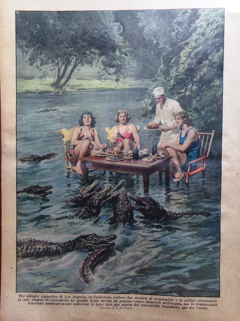 Tre allegre signorine di Los Angeles, in California, vollero far mostra di originalità e di ardire pranzando in uno stagno di coccodrilli. Le gambe della tavola da pranzo erano immerse nell'acqua, ma le commensali tenevano prudentemente sollevate le loro: non per aver paura dei coccodrilli, ma dei reumi (Achille Beltrame)