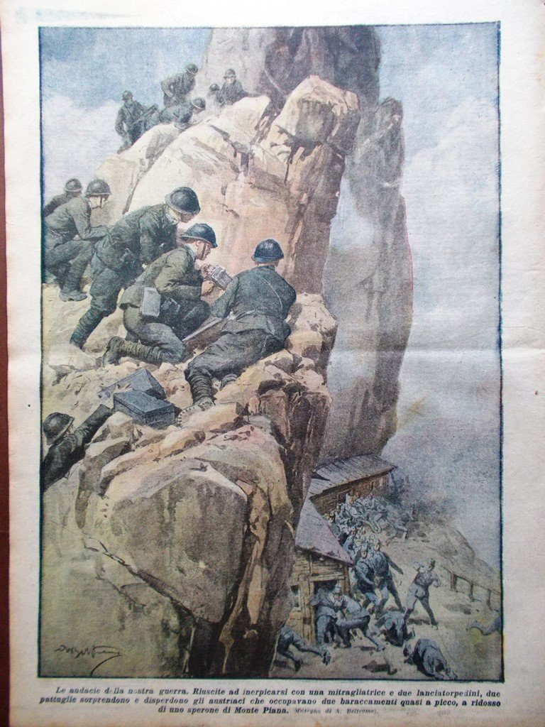 Le audacie della nostra guerra. Riuscite ad inerpicarsi con una mitragliatrice e due lanciatorpedini, due pattuglie sorprendono e disperdono gli austriaci che occupavano due baraccamenti quasi a picco, a ridosso di uno sperone di Monte Piana (Achille Beltrame)