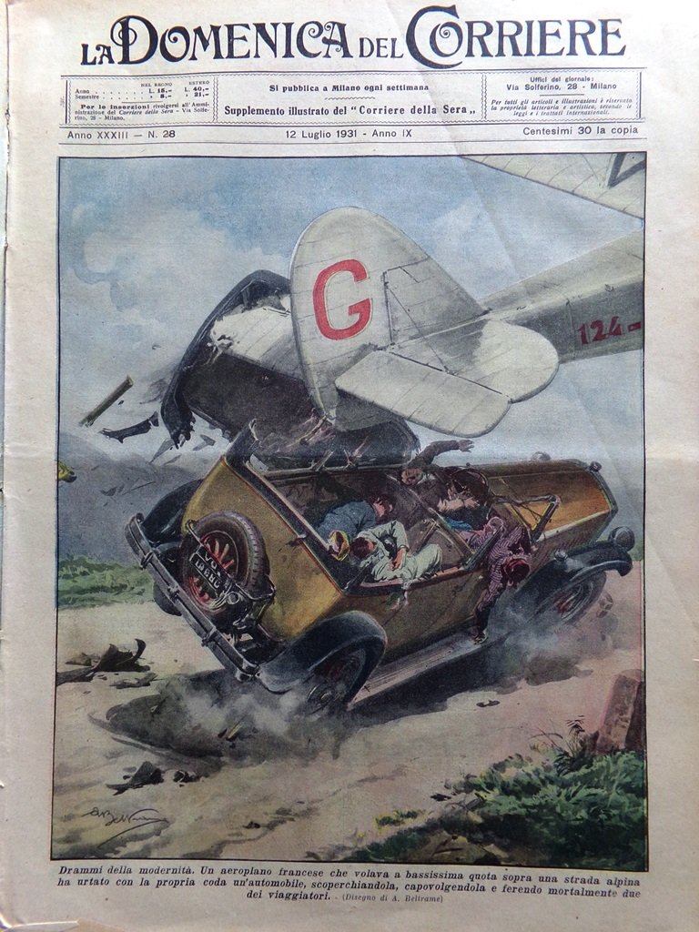 Drammi della modernità . Un aeroplano francese che volava a bassissima quota sopra una strada alpina ha urtato con la propria coda un'automobile, scoperchiandola, capovolgendola e ferendo mortalmente due dei viaggiatori (Achille Beltrame)