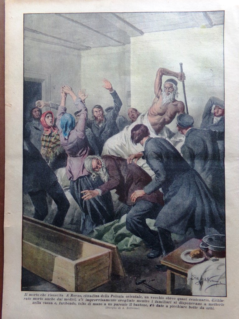 A Rovno, cittadina della Polonia orientale, un vecchio ebreo quasi centenario, dichiarato morto anche dai medici, si è improvvisamente svegliato mentre i familiari si disponevano a metterlo nella cassa e, furibondo, tolto di mano a un parente il bastone, si è dato a picchiare botte da orbi (Achille Beltrame)