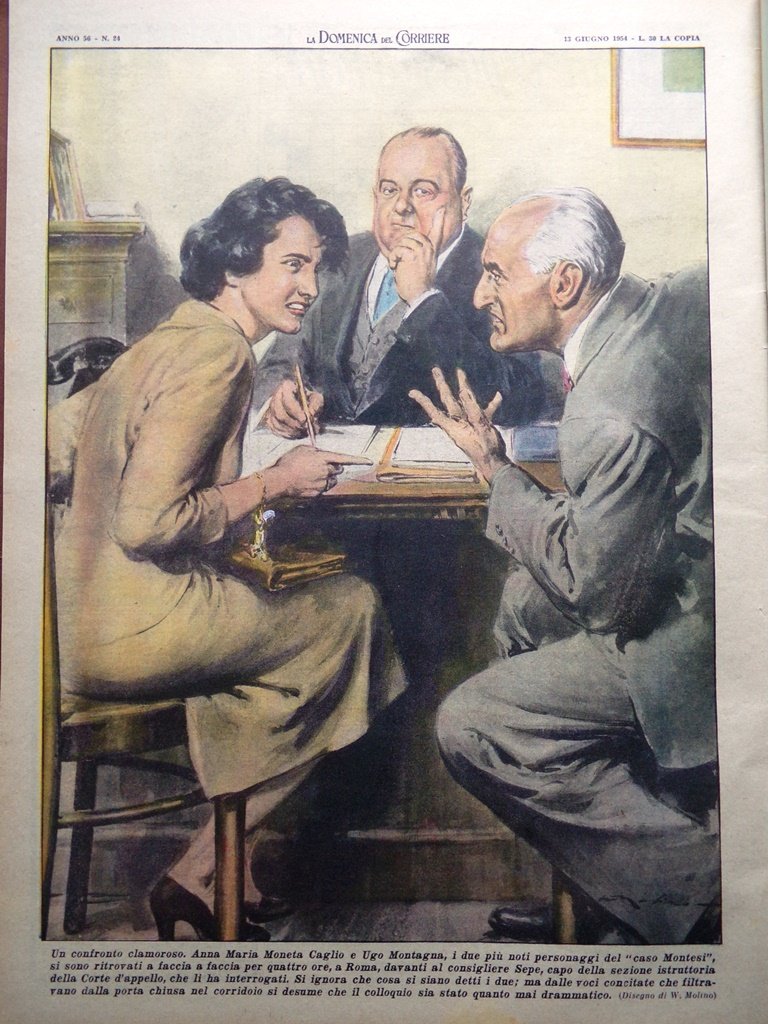 Anna Maria Moneta Caglio e Ugo Montagna, i due più noti personaggi del "caso Montesi" si sono ritrovati faccia a faccia per quattro ore, a Roma, davanti al consigliere Sepe, capo della sezione istruttoria della Corte d'appello, che li ha interrogati (Walter Molino)