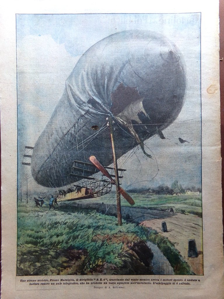 Presso Marsiglia, il dirigibile "B.Z. 4" trascinato dal vento mentre aveva i motori spenti, è andato a battere contro un palo telegrafico, che ha prodotto un vasto squarcio nell'involucro. L'equipaggio si è salvato (Achille Beltrame)