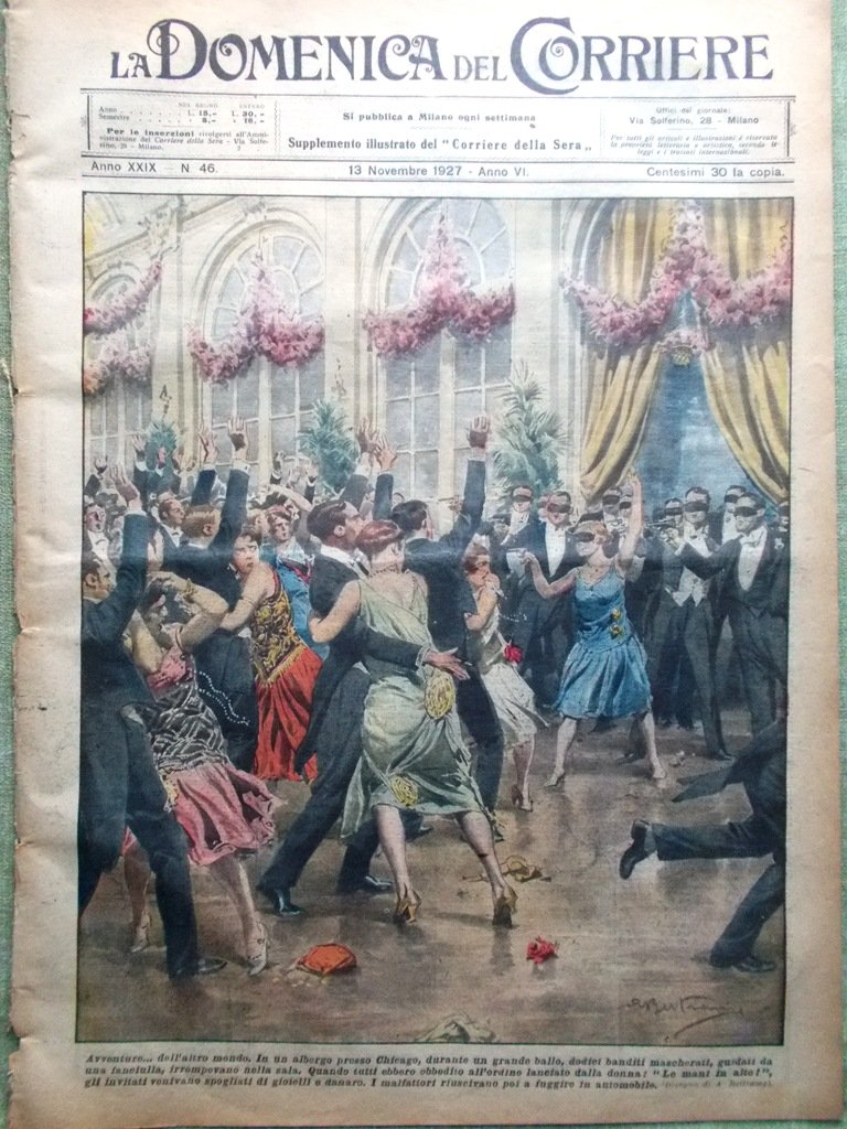 LA DOMENICA DEL CORRIERE Rivista Originale del 13 Novembre 1927 Anno 29 nr. 46 pagine: 16 dimensioni: 38 x 28 cm IN PRIMA PAGINA: In un albergo presso Chicago, durante un gran ballo, dodici banditi mascherati, guidati da una fanciulla, irrompevano nella sala. Quando tutti ebbero obbedito all'ordine lanciato dalla donna: "Le mani in alto!", gli invitati venivano spogliati di gioielli e danaro. I malfattori riuscivano poi a fuggire in automobile (Achille Beltrame) NELL'ULTIMA PAGINA: Durante la furiosa burrasca sull'Inghilterra. A Chester, la caduta di un gruppo di camini ha fatto rovinare una casa e dopo il crollo si è sviluppato un incendio. Il salvataggio è stato lungo e pericoloso. Certo Price, salito eroicamente su una scala cadente per salvare due bimbi rimasti a letto aveva appena preso in braccio i piccini quando il pavimento gli è crollato sotto i piedi e tutti sono rimasti feriti (Achille Beltrame) ALL'INTERNO: I collezionisti di etichette. La celebrazione del V annuale fascista: duce, Ciano, Grandi, Giampaoli. Gigantesco ritratto del duce eseguito a Parma L'inaugurazione dell'acquedotto pugliese a Lecce Il varo dell' Ausonia a Genova L'inaugurazione del Parco delle Rimembranze a Bergamo. Il monumento di San Francesco d'Assisi a Milano. La stazione di Napoli nella direttissima Napoli-Roma. Avventura in mezzo ai ghiacci. Guglielmo Marconi a New York visita il monumento ai radiotelegrafisti CONDIZIONI DELLA RIVISTA: BUONE, NORMALI SEGNI DEL TEMPO, SOVRACOPERTINE MANCANTI NOTE PARTICOLARI: STRAPPETTO NEL BORDO ESTERNO DI QUASI TUTTO IL GIORNALE E QUALCHE STRAPPETTO NELL'ATTACCATURA CENTRALE (V. FOTO)