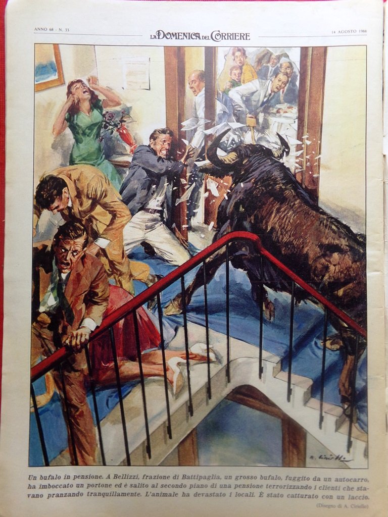 Un bufalo in pensione. A Bellizzi, frazione di Battipaglia, un grosso bufalo fuggito da un autocarro ha imboccato un portone ed è salito al secondo piano di una pensione terrorizzando i clienti che stavano pranzando tranquillamente. L'animale ha devastato i locali. È stato catturato con un laccio (A. Ciriello)