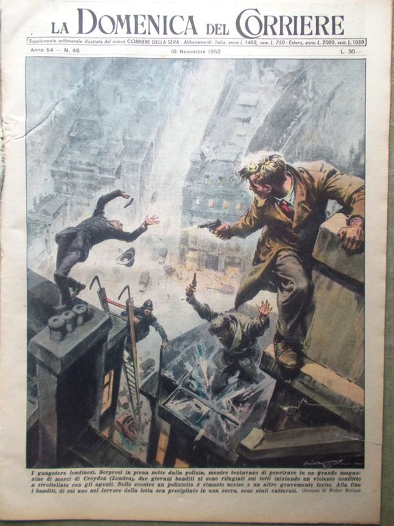 Sorpresi in piena notte dalla polizia mentre tentavano di penetrare in un grande magazzino di merci di Croydon (Londra) due giovani banditi si sono rifugiati sui tetti iniziando un violento conflitto a rivoltellate con gli agenti (Walter Molino)