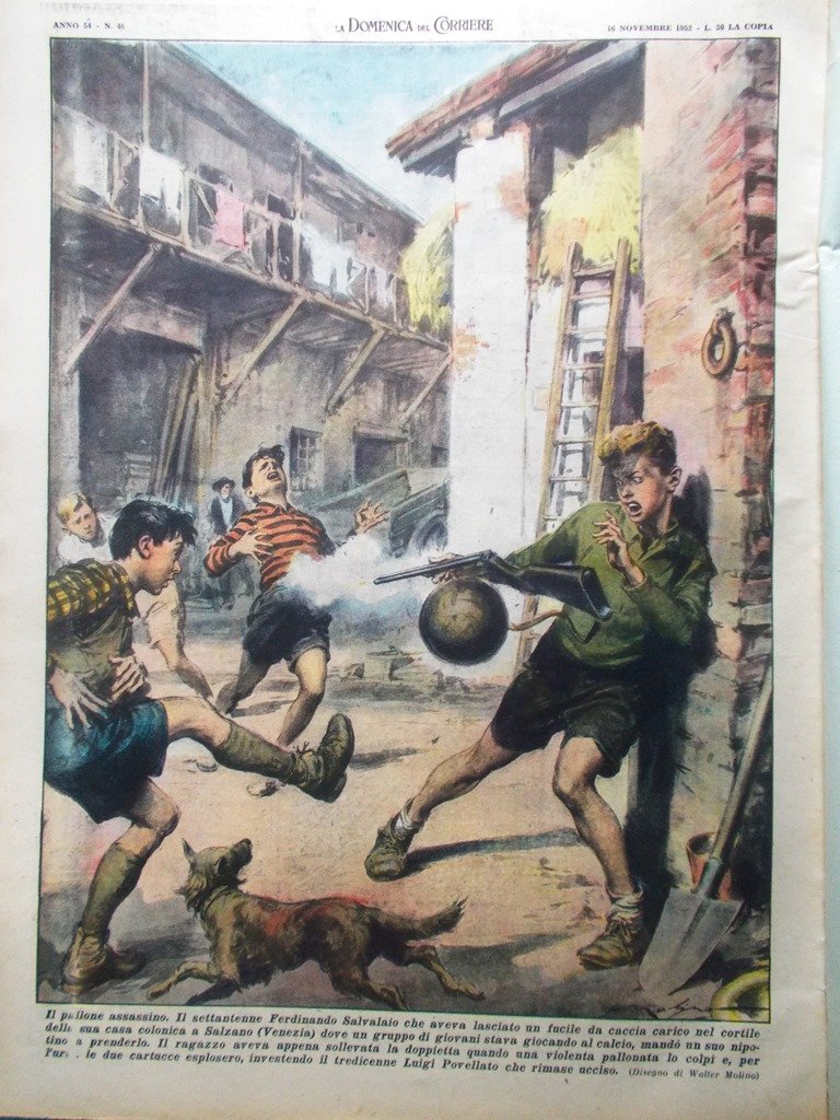 Il settantenne Ferdinando Salvalaio che aveva lasciato un fucile da caccia carico nel cortile della sua casa a Salzano (Venezia) dove un gruppo di giovani stava giocando a calcio, mandò un suo nipotino a prenderlo. Il ragazzi aveva appena sollevata la doppietta quando una violenta pallonata lo colpì e per l'urto le due cartucce esplosero uccidendo il tredicenne Luigi Povellato (Walter Molino)