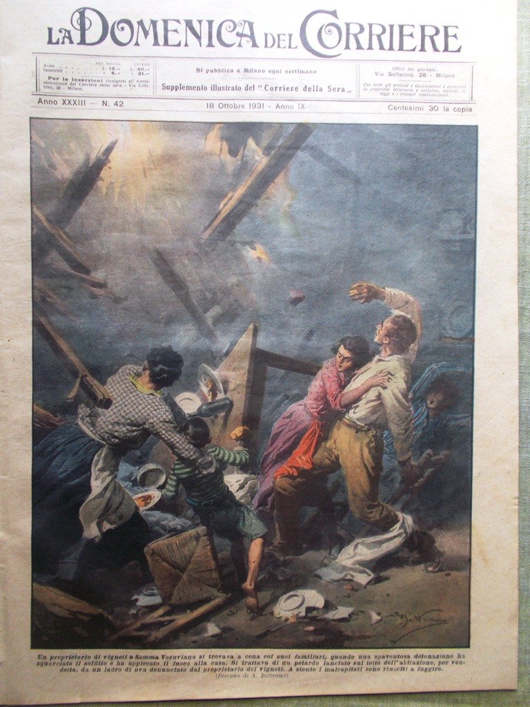 Un proprietario di vigneti a Somma Vesuviana si trovava a cena coi suoi familiari, quando una spaventosa detonazione ha squarciato il soffitto e ha appiccato il fuoco alla casa. Si trattava di un petardo lanciato sul tetto dell'abitazione, per vendetta, da un ladro di uva denunciato dal proprietario dei vigneti. A stento i malcapitati sono riusciti a fuggire (Achille Beltrame)
