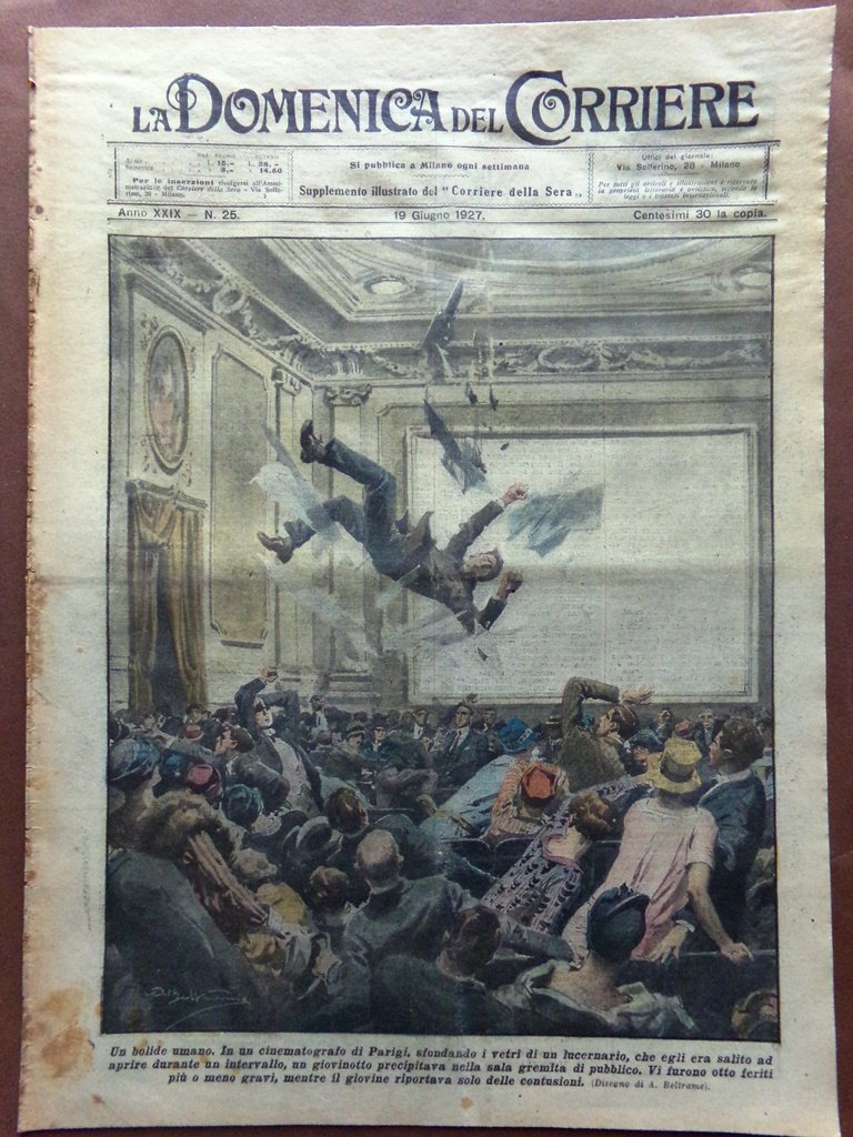 Un bolide umano. In un cinematografo di Parigi, sfondando i vetri di un lucernario, che egli era salito ad aprire durante un intervallo, un giovinotto precipitava nella sala gremita di pubblico. Vi furono otto feriti pi o meno gravi, mentre il giovine riportava solo delle contusioni (Achille Beltrame)