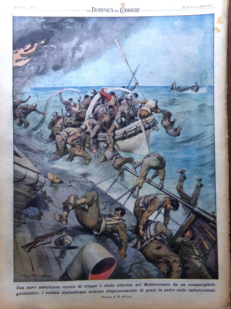 Una nave americana carica di truppe è stata silurata nel Mediterraneo da un sommergibile germanico: i soldati statunitensi tentano disperatamente di porsi in salvo sulle imbarcazioni (Walter Molino)
