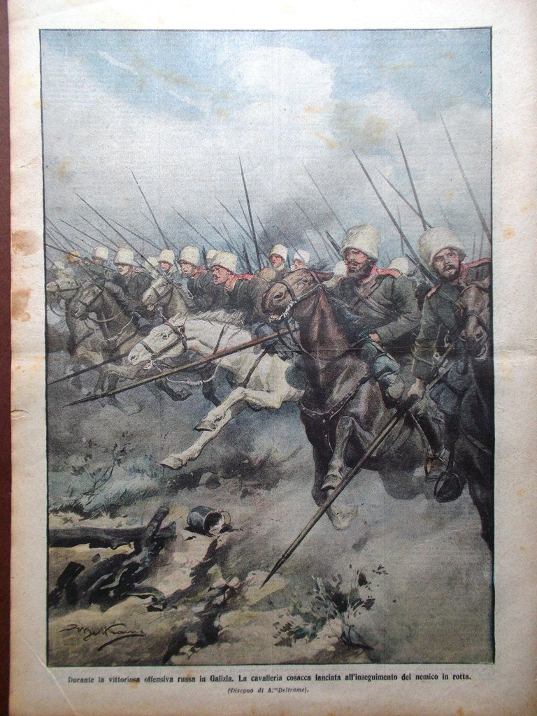 Durante la vittoriosa offensiva russa in Galizia. La cavalleria cosacca lanciata all'inseguimento del nemico in rotta (Achille Beltrame)