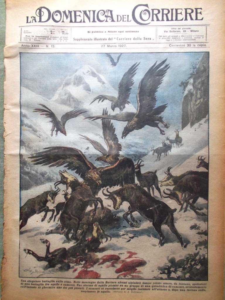 Una singolare battaglia sulle cime. Nelle montagne della Baviera alcuni alpinisti hanno potuto essere da lontano spettatori di una battaglia fra aquile e camosci. I camosci, dopo una furiosa lite riuscirono a respingere le aquile (Achille Beltrame)