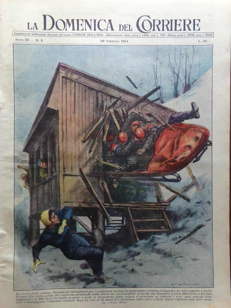 Durante gli allenamenti per i campionati italiani di guido-slitta a Cortina d'Ampezzo, un bob a quattro è uscito di pista alla curva prima del traguardo, piombando sulla cabina dei cronometristi. Il bolide, che marciava a circa 100 all'ora e del peso complessivo di 640 chili, ha forato da parte a parte la baracchetta, senza colpire il personale, né rompere i vetri della facciata anteriore o danneggiare l'impianto elettrico. Dopo un volo di 30 metri, si è fracassato sulla neve. I piloti hanno riportato solo lievi ferite (Walter Molino)
