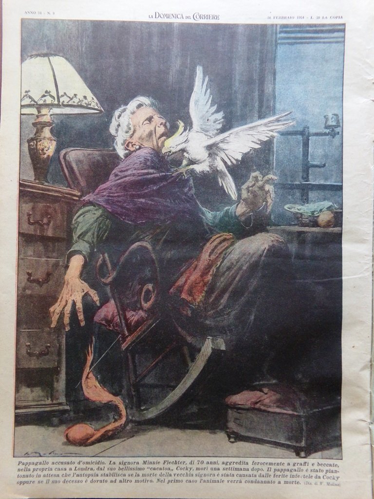 La signora Minnie Fletcher di 70 anni aggredita ferocemente a graffi e beccate, nella propria casa a Londra, dal suo bellissimo "cacatoa" Cocky morì una settimana dopo. Il pappagallo è stato piantonato in attesa che l'autopsia stabilisca se la morte della vecchia signora è stata causata dalle ferite infertele da Cocky oppure se il suo decesso è dovuto a un altro motivo (Walter Molino)