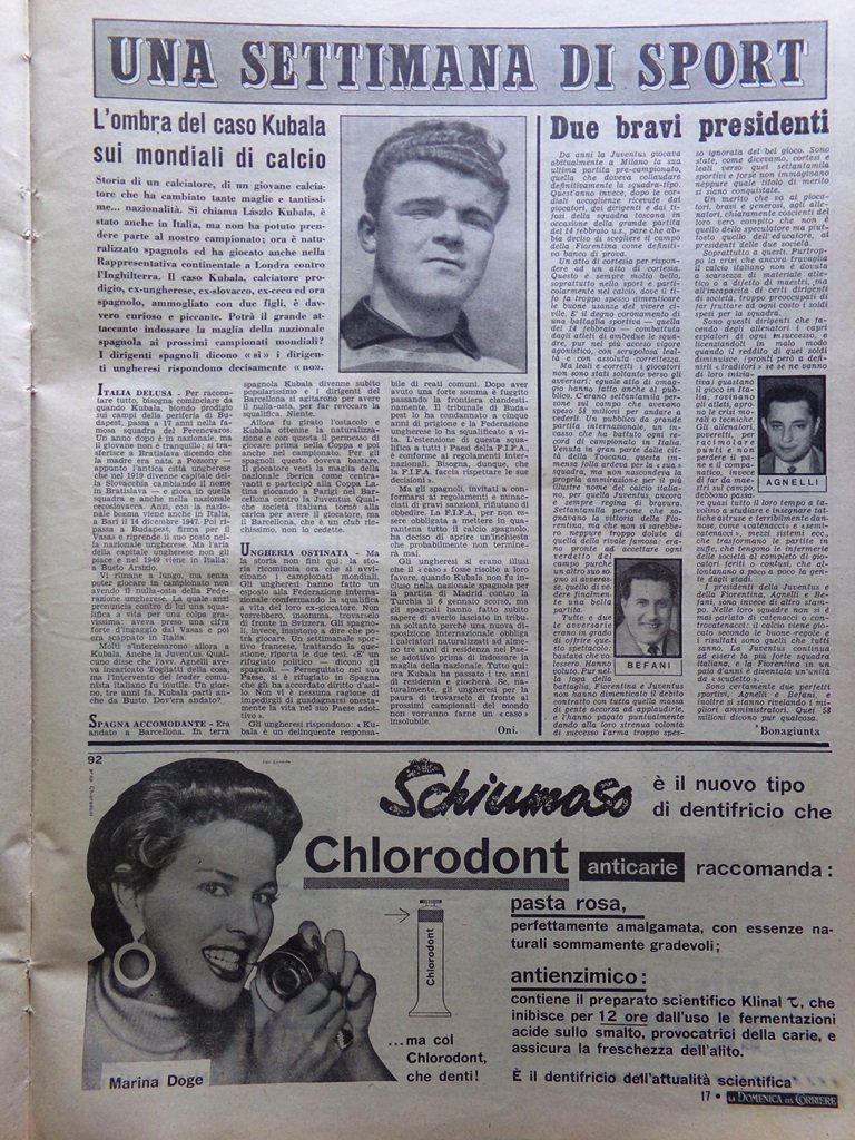 Sport: l'ombra del caso Kubala sui mondiali di calcio, due bravi presidenti (Agnelli, Befani)