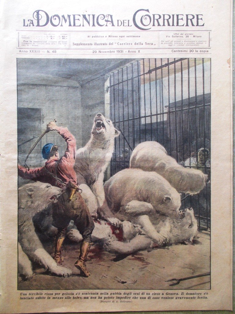 Una terribile rissa per gelosia si è scatenata nella gabbia degli orsi di un circo a Genova. Il domatore s'è lanciato subito in mezzo alle belve ma non ha potuto impedire che una di esse venisse gravemente ferita (Achille Beltrame)