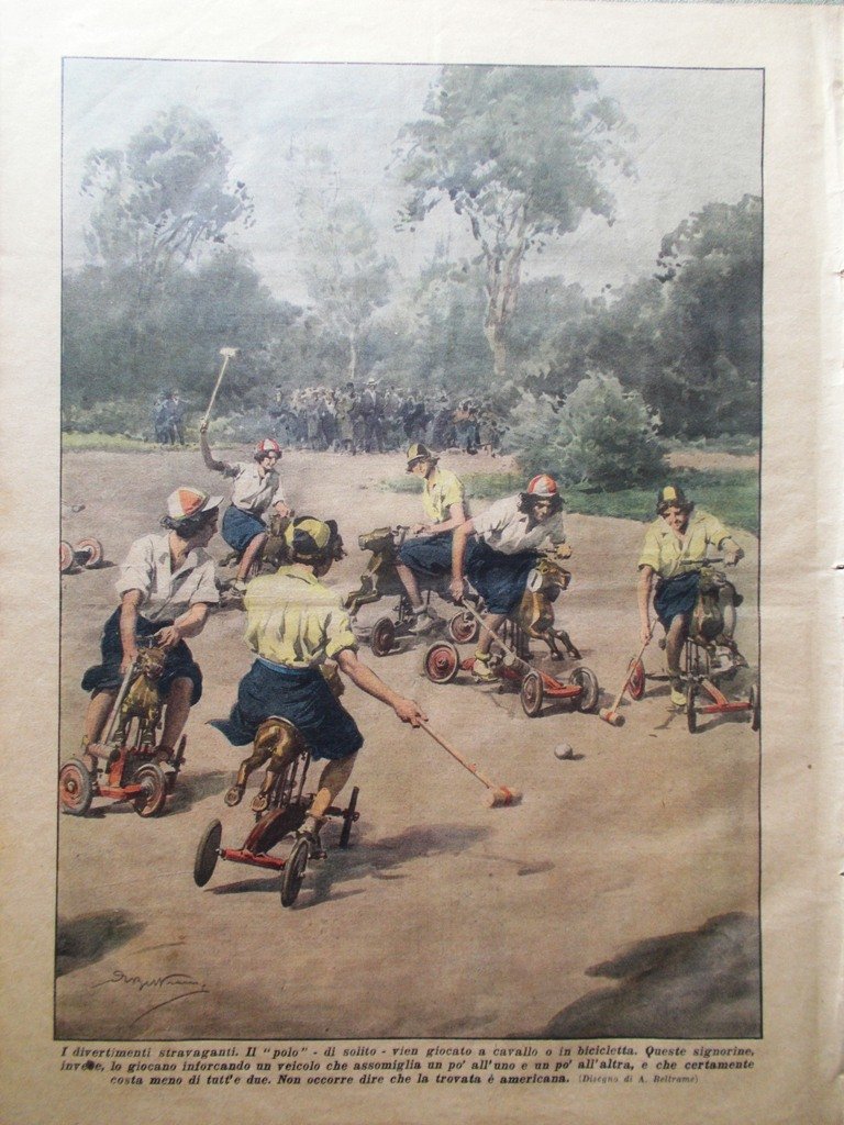 I divertimenti stravaganti. Il polo, di solito vien giocato a cavallo o in bicicletta. Queste signorine invece lo giocano inforcando un veicolo che assomiglia un po' all'una e un po' all'altra e che certamente costa meno di tutti e due. Non occorre dire che la trovata è americana (Achille Beltrame)