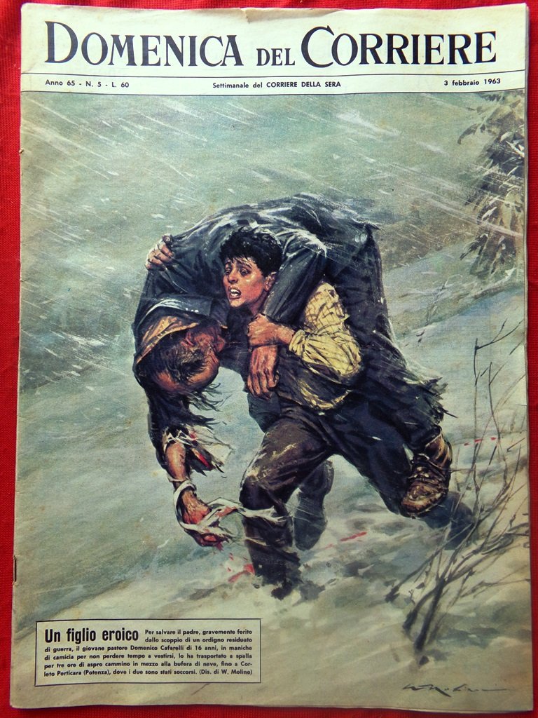Per salvare il padre, gravemente ferito dallo scoppio di un ordigno residuato di guerra, il giovane pastore Domenico Cefarelli di 16 anni, in maniche di camicia, lo ha trasportato a spalla per tre ore di aspro cammino in mezzo alla bufera di neve, fino a Corleto Perticara (Potenza) dove i due sono stati soccorsi