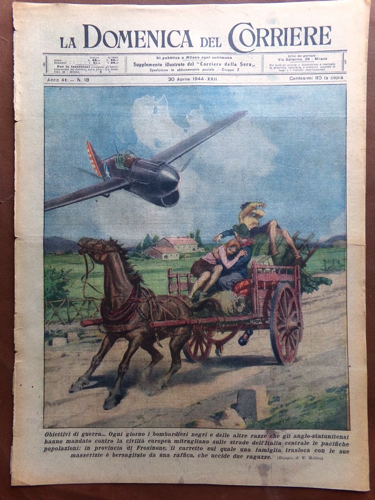 Obiettivi di guerra.Ogni giorno i bombardieri negri e delle altre razze che gli anglo-statunitensi hanno mandato contro la civiltà europea mitragliano sulle strade dell'Italia centrale le pacifiche popolazioni: in provincia di Frosinone, il carretto sul quale una famiglia trasloca con le sue masserizie è bersagliato da una raffica che uccide due ragazze (Walter Molino)