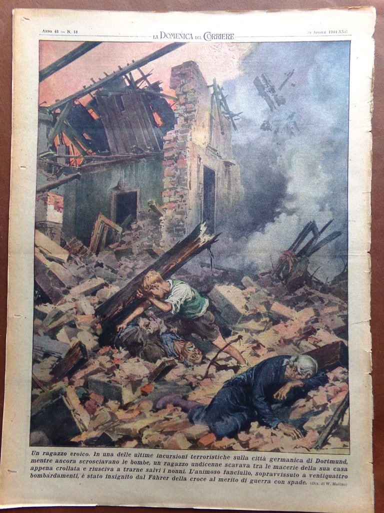 In una delle ultime incursioni terroristiche sulla città germanica di Dortmund, mentre ancora scrosciavano le bombe, un ragazzo undicenne scavava tra le macerie della sua casa appena crollata e riusciva a trarne salvi i nonni. L'animoso fanciullo, sopravvissuto a 24 bombardamenti è stato insignito dal Fuhrer della croce al merito di guerra con spade (Walter Molino)
