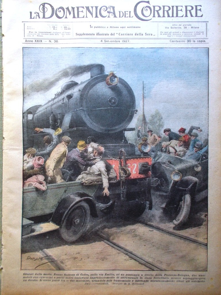 LA DOMENICA DEL CORRIERE Rivista Originale del 4 Settembre 1927 Anno 29 nr. 36 pagine: 16 dimensioni: 38 x 28 cm IN PRIMA PAGINA: Sfiorati dalla morte. Presso Saliceto di Cadeo, sulla via Emilia, a un passaggio a livello della Piacenza-Bologna, due automobilisti susseguentisi a pochi metri, tentavano di attraversare la linea ferroviaria mentre arrivava un treno che passò tra le due macchine lasciandoli miracolosamente illesi (Achille Beltrame) NELL'ULTIMA PAGINA: La sfortuna di due audaci. Nelle acque di Dover, un drammatico incidente ha troncato la prima prova del "Carrie" curioso minuscolo battello costruito per la traversata dell'Atlantico da due inglesi, Tierney e Matthewson, veterano della guerra di Crimea. Per la rottura del cavo di rimorchio, Tierney urtò nel boccaporto e svenne ma fu salvato dal suo compagno con l'aiuto dei marinai accorsi (Achille Beltrame) ALL'INTERNO: L'arrivo del campionato del Tevere a Roma: il nuotatore Pinotti. La bottega moderna alla mostra di Monza La donna e lo sport: Erkens, Junck Tre beniamini del pubblico: Petrolini, Gandusio e Fregoli Alla tendopoli sucaina di Courmayer, l'on. Turati. Il centenario di San Rocco a Roma. In onore del maresciallo Caviglia, a Finale Ligure. Mombello, oasi di pace. CONDIZIONI DELLA RIVISTA: BUONE, NORMALI SEGNI DEL TEMPO, SOVRACOPERTINE MANCANTI NOTE PARTICOLARI: PICCOLI STRAPPETTI NEI BORDI DI ALCUNE PAGINE