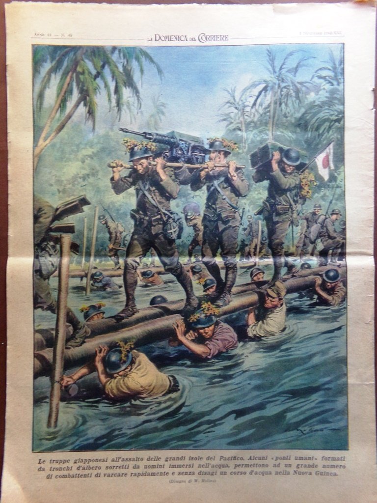 Le truppe giapponesi all'assalto delle grandi isole del Pacifico. Alcuni "ponti umani" formati da tronchi d'albero sorretti da uomini immersi nell'acqua, permettono a un grande numero di combattenti di varcare rapidamente e senza disagi un corso d'acqua della Nuova Guinea (Walter Molino)